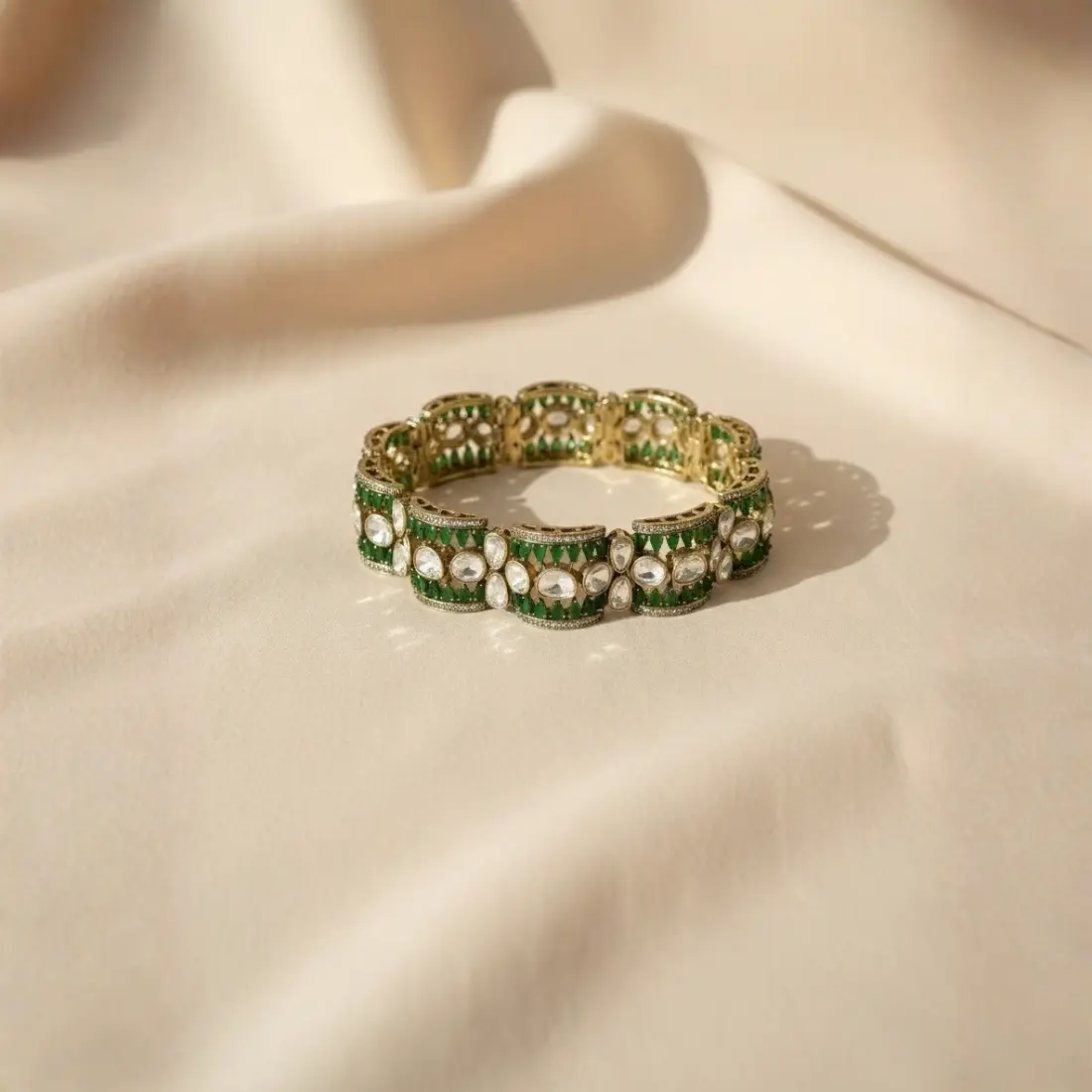Designed to sit comfortably on the wrist, the Emerald Crest Bracelet is ideal for weddings, festive occasions, family celebrations, and cultural gatherings. It pairs effortlessly with sarees, lehengas, anarkalis, and even contemporary fusion outfits, making it a versatile addition to your jewellery collection.