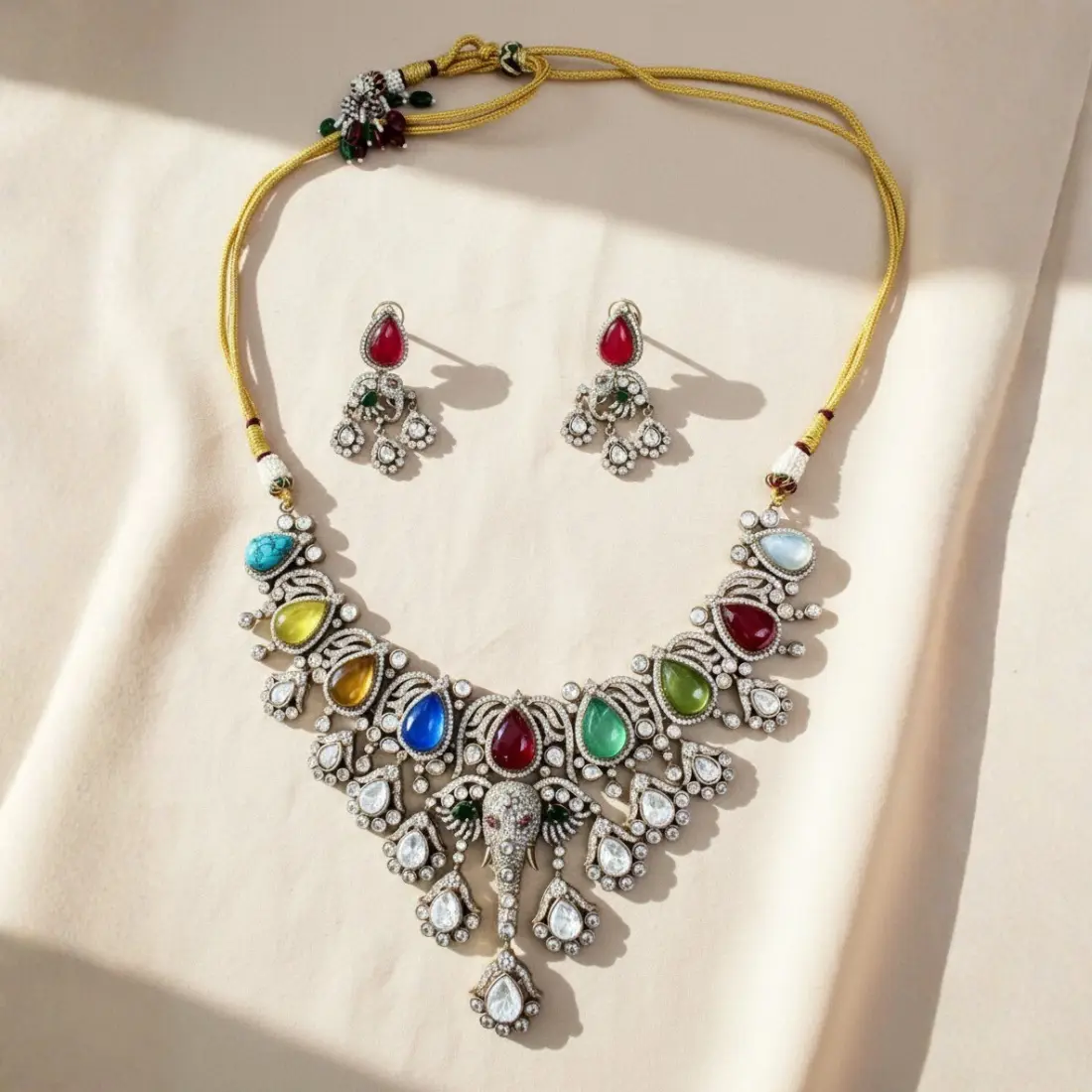 The necklace showcases vibrant navratna-inspired multicolour stones, delicately arranged in a harmonious palette of ruby red, emerald green, sapphire blue, pearl white, turquoise, and citrine hues. Each stone is meticulously framed with high-quality zircon detailing, adding a luminous sparkle that enhances the grandeur of the design. The intricate elephant motif flows into cascading pear-shaped accents, creating a rich, layered silhouette that sits gracefully along the neckline.