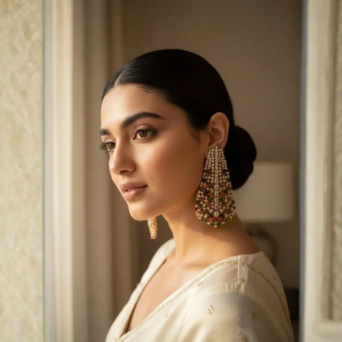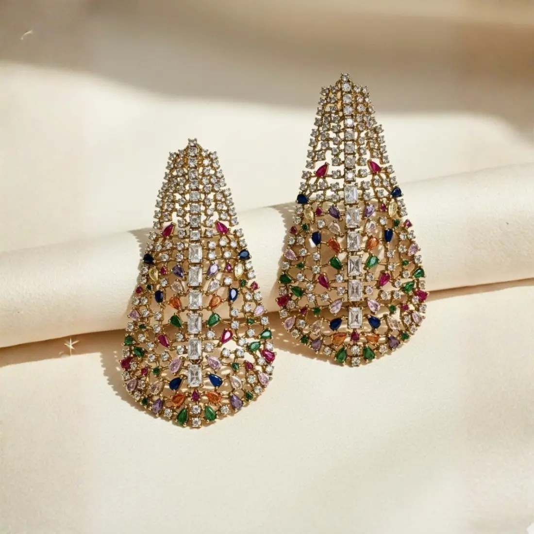 Versatile and striking, the Riva Navratna Drops pair beautifully with sarees, lehengas, anarkalis, and modern ethnic ensembles. Whether styled for weddings, festive celebrations, evening functions, or special occasions, they add a touch of glamour without overwhelming the outfit.